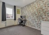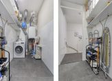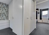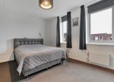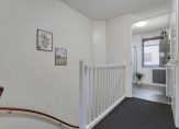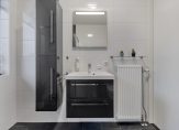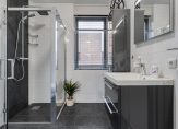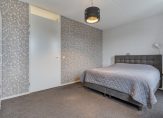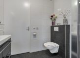 Op de verdieping een overloop; twee slaapkamers waarvan de hoofdslaapkamer over de volledige breedte; berging met aansluiting voor de wasmachine en tenslotte een badkamer voorzien van inloopdouche, wastafelmeubel en tweede toilet.