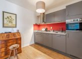 Hal/entree. Badkamer met douche, toilet, wastafel en wasmachineaansluiting. Woonkamer en open keuken met inbouwapparatuur (koel-vriescombinatie, combi-oven/combimagnetron), deur naar het balkon (op het zuiden), tevens is de slaapkamer bereikbaar vanuit de woonkamer.