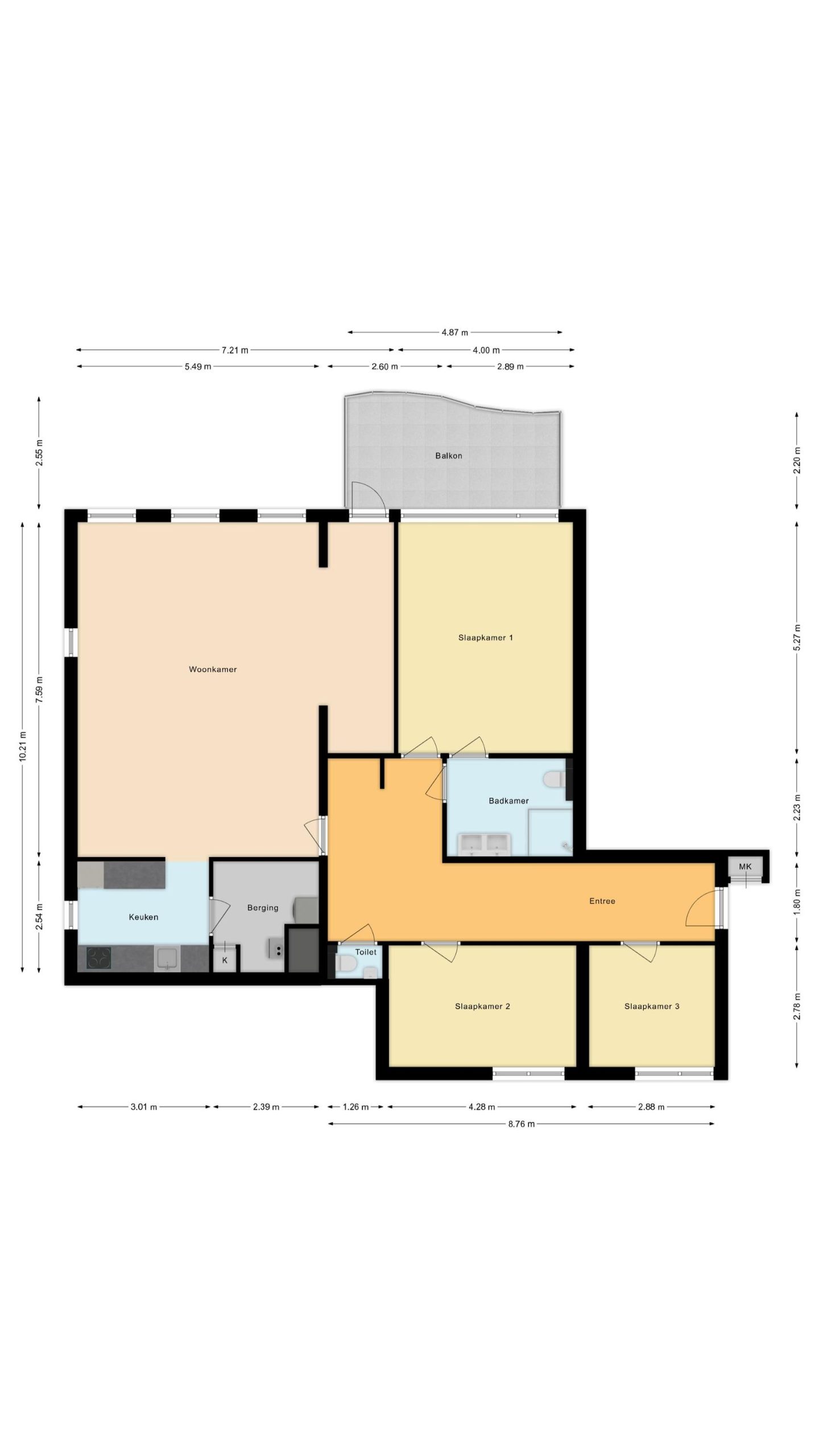 Via de inpandige entree bereik je de hal met toegang tot alle vertrekken. De woonkamer is ruim en licht en geeft toegang tot het balkon van ca. 12 m². Aangrenzend bevindt zich de halfopen keuken, voorzien van een vaatwasser, inductiekookplaat, combi-magnetron, koelkast en kokendwaterkraan. Vanuit de keuken is de berging/provisiekast bereikbaar, met witgoedaansluitingen en extra bergruimte. Het appartement beschikt over drie slaapkamers. Daarnaast is er een separate toiletruimte met hangtoilet en fontein. De badkamer is ingericht met een dubbele wastafel, douche en een tweede hangtoilet.