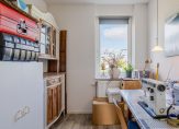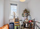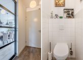Op de tweede woonlaag een overloop, betegelde toiletruimte met fonteintje; straatgerichte open keuken met diverse inbouw apparatuur; ruime en lichte woonkamer met openslaande tuindeuren naar het dakterras.