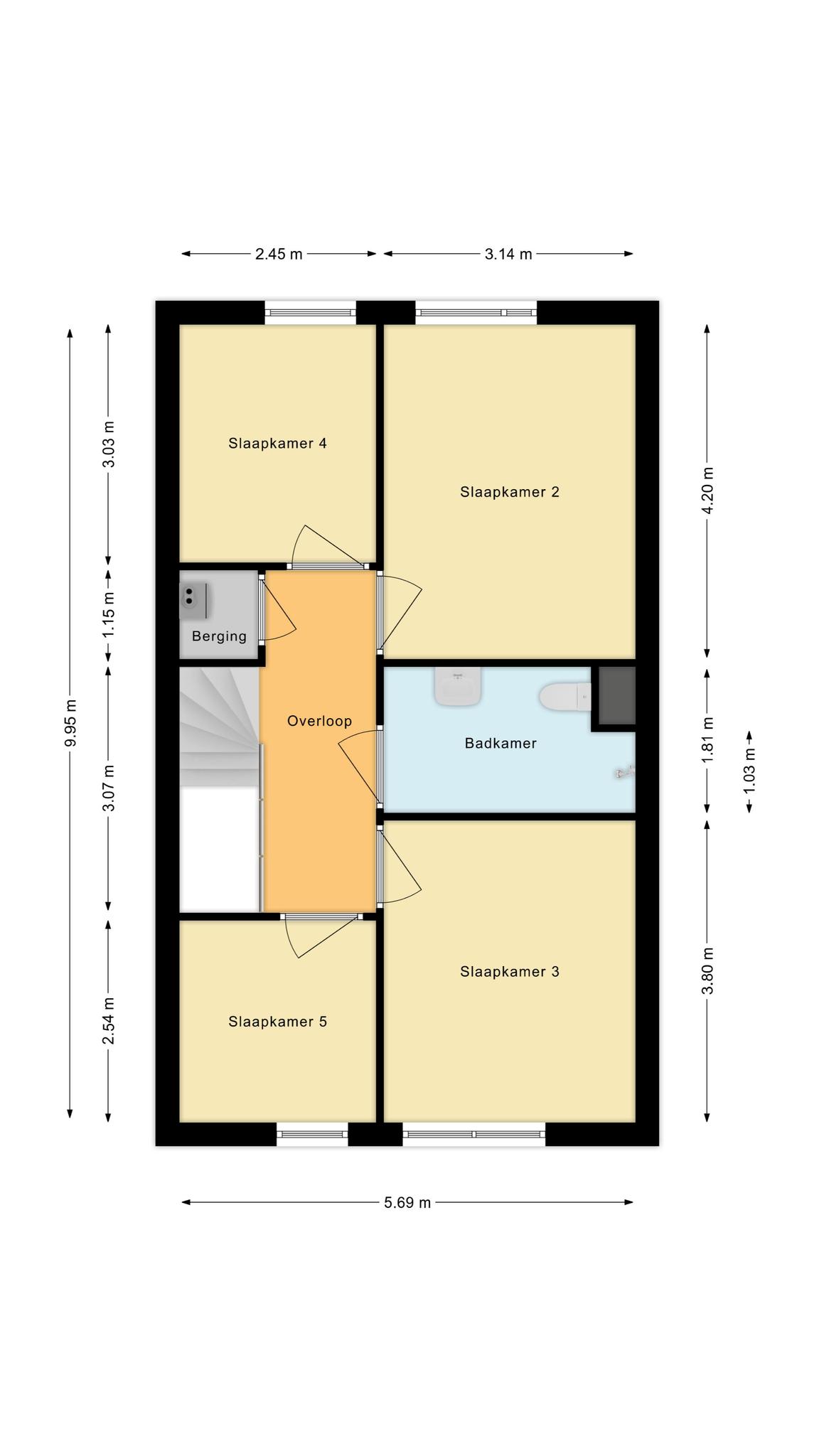 Op de derde woonlaag wederom een overloop; vier slaapkamers en een tweede badkamer met inloopdouche, wastafel meubel en het 3e toilet.