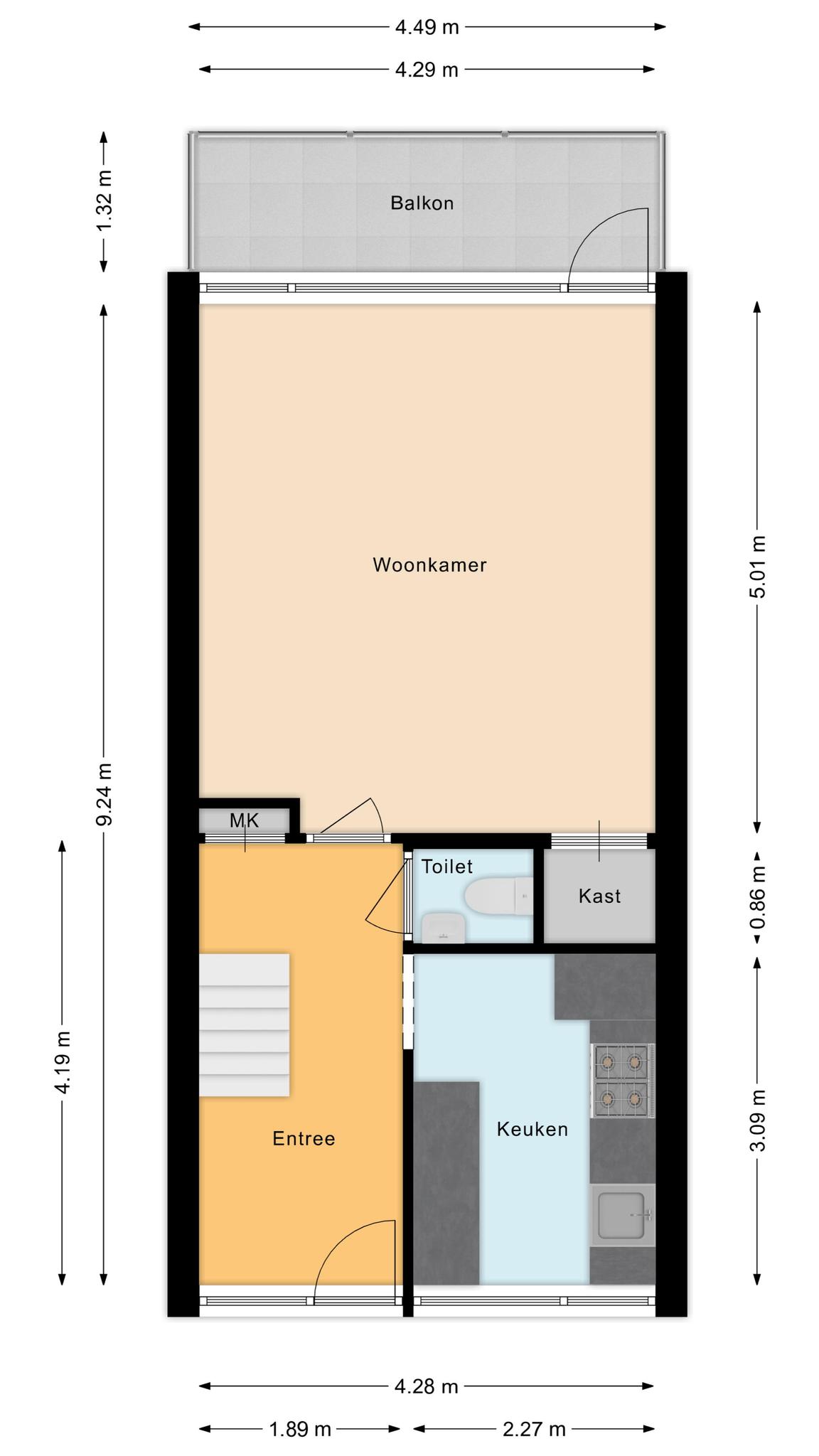 – hal/entree met intercom, meterkast, trapopgang, trapkast en toiletruimte;