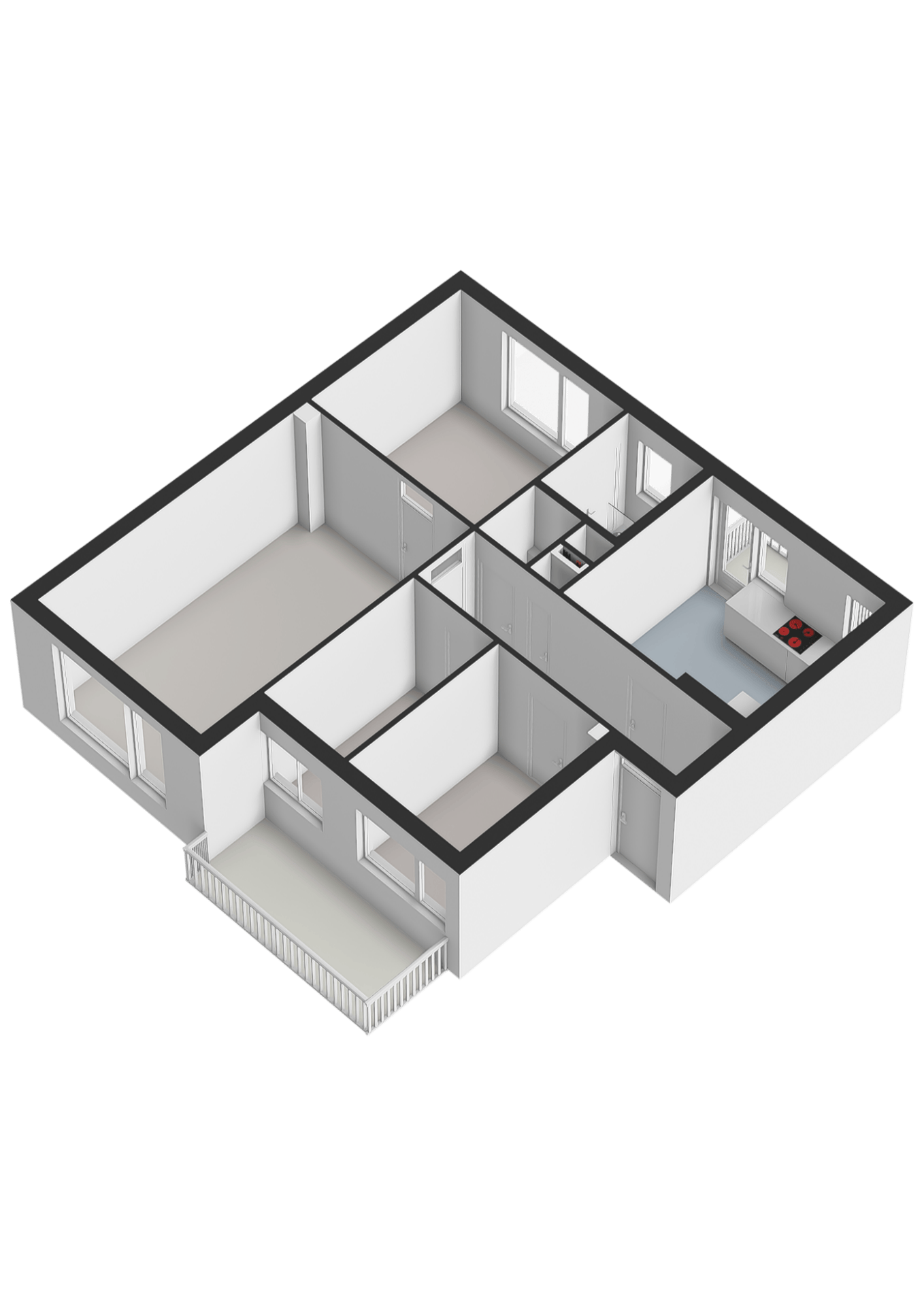 Entree, meterkast, modern toilet met fontein. Keuken met inbouwapparatuur (o.a. inductie, vaatwasser, koelkast, vriezer) en wasmachineaansluiting, eerste balkon. Eerste en tweede slaapkamer. Woonkamer met deur naar tweede balkon. Derde slaapkamer met aangrenzende moderne badkamer voorzien van inloopdouche, wastafel en designradiator.