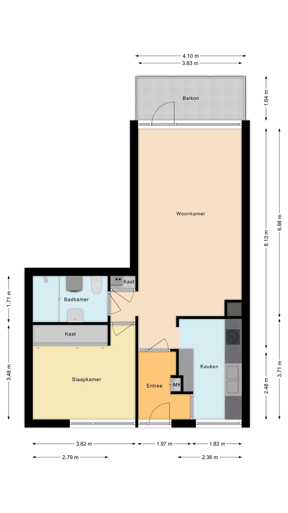 Entree met meterkast; keuken met keramische kookplaat, dubbele wastafel, vaatwasser en gasfornuis; woonkamer met videofoon, blokverwarming, zonnescherm en toegang tot het balkon op het zuiden; badkamer voorzien van witgoedaansluiting, wastafel, toilet en douche; slaapkamer met schuifkastenwand.
