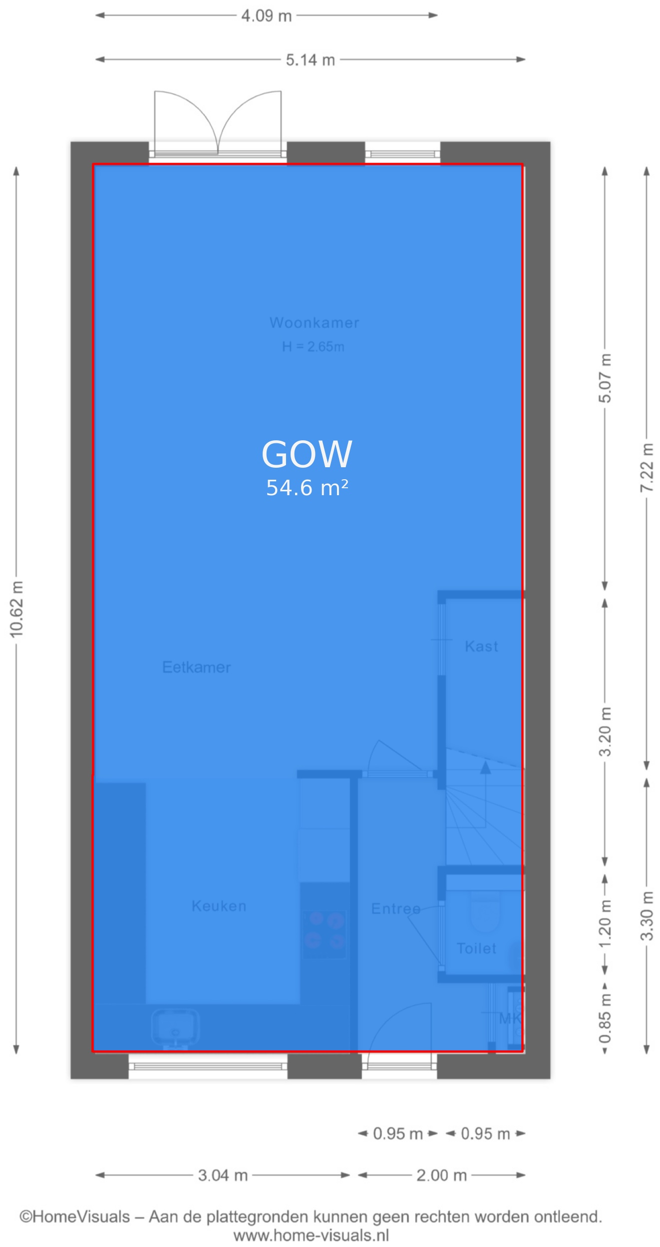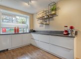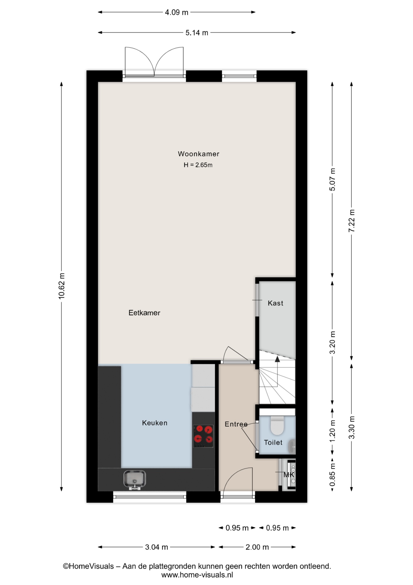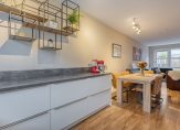 Begane grond: Entree/hal, meterkast, toilet met fontein, trapopgang. Woonkamer met open keuken met inbouwapparatuur (o.a. koel-vriescombinatie, inductiekookplaat, oven, combi-oven/magnetron, vaatwasser), trapkast.