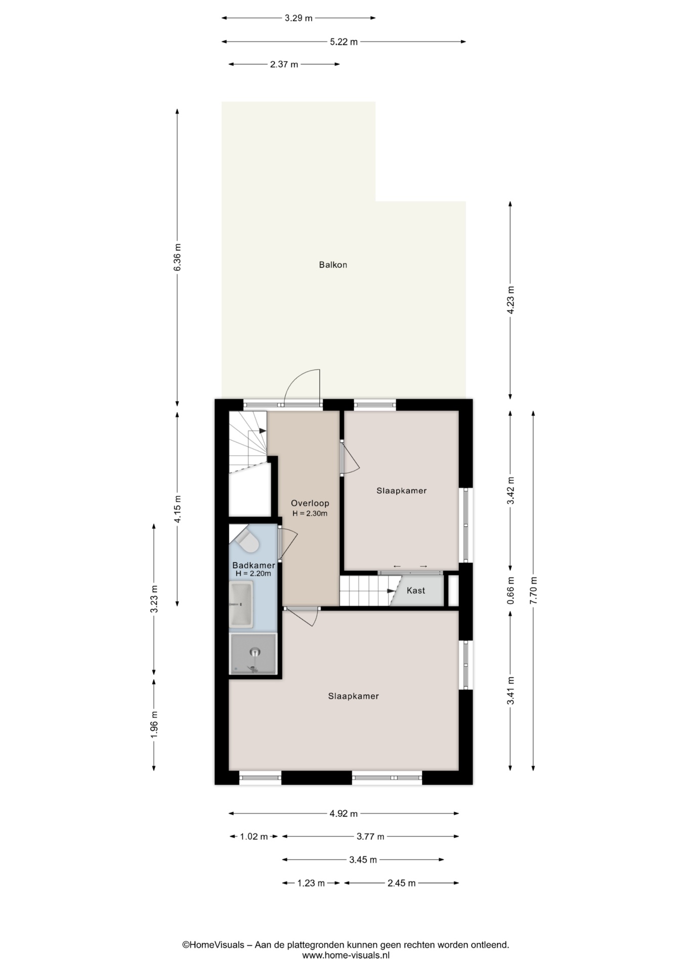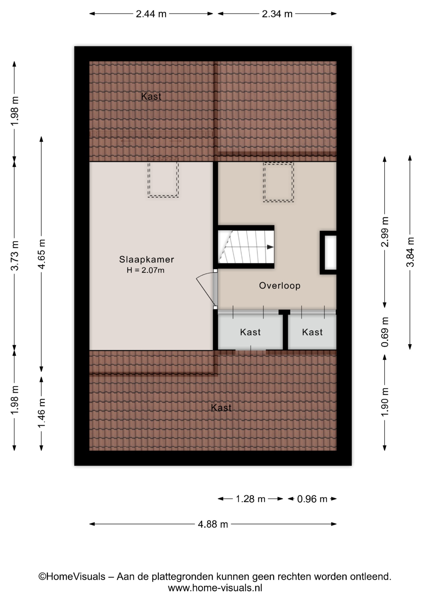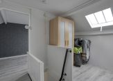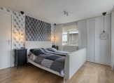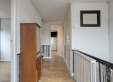 Op de eerste verdieping bevindt zich een overloop met toegang tot het platte dak/dakterras, twee slaapkamers (waarvan één met schuifkastenwand) en een tweede badkamer met douche, tweede toilet en wastafel met meubel. Via een vaste trap is de tweede verdieping bereikbaar met een overloop met vaste kastruimte en de derde slaapkamer.