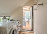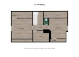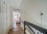 overloop met vide, berging en stookruimte, toilet, 2 slaapkamers v.v. laminaat ca. 450×340 en 400×340 ( met vaste wastafel). De 1e verdieping is geheel v.v. een nieuwe laminaatvloer.