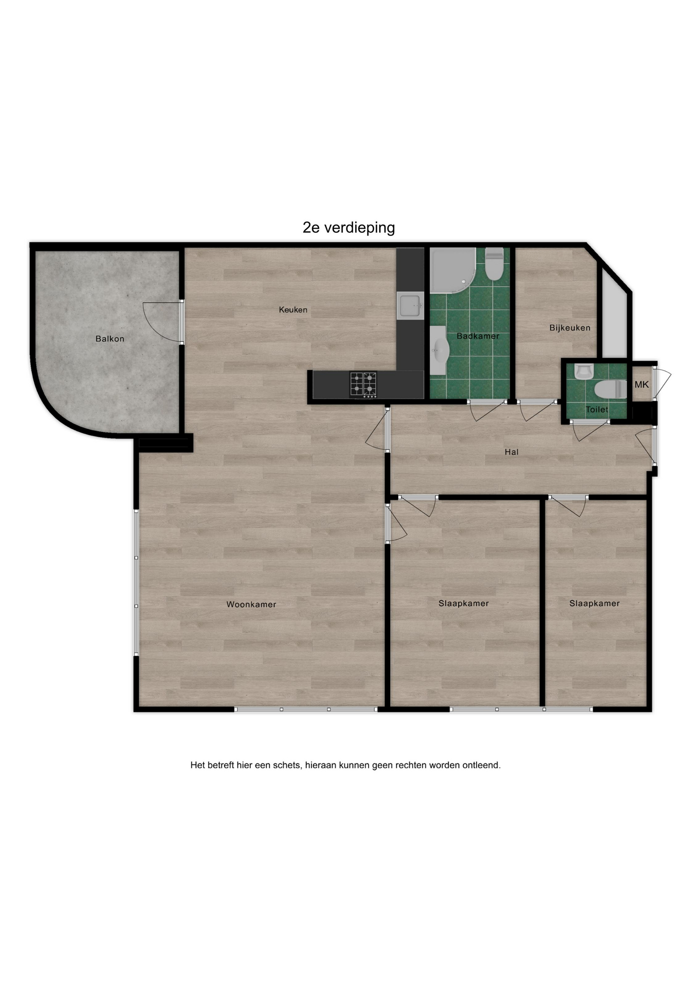 Appartement: royale entree/hal, woonkamer (ca. 540×534), toegang tot balkon. Open keuken met inbouwapparatuur (ca. 510×330), 2 slaapkamers (ca. 429×316 en 429×215), badkamer met wastafelmeubel, douchecabine en 2e toilet, separaat toilet, bijkeuken v.v. plavuizen (ca. 330×175). Het appartement is grotendeels v.v. een kurkvloer.