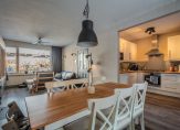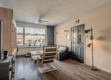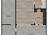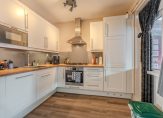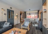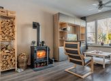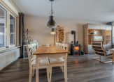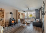 entree/hal met laminaatvloer, toilet, zonnige woonkamer ca. 730×360 met houtkachel en laminaatvloer, moderne,open keuken v.v. inbouwapparatuur ca. 300×225.