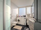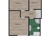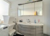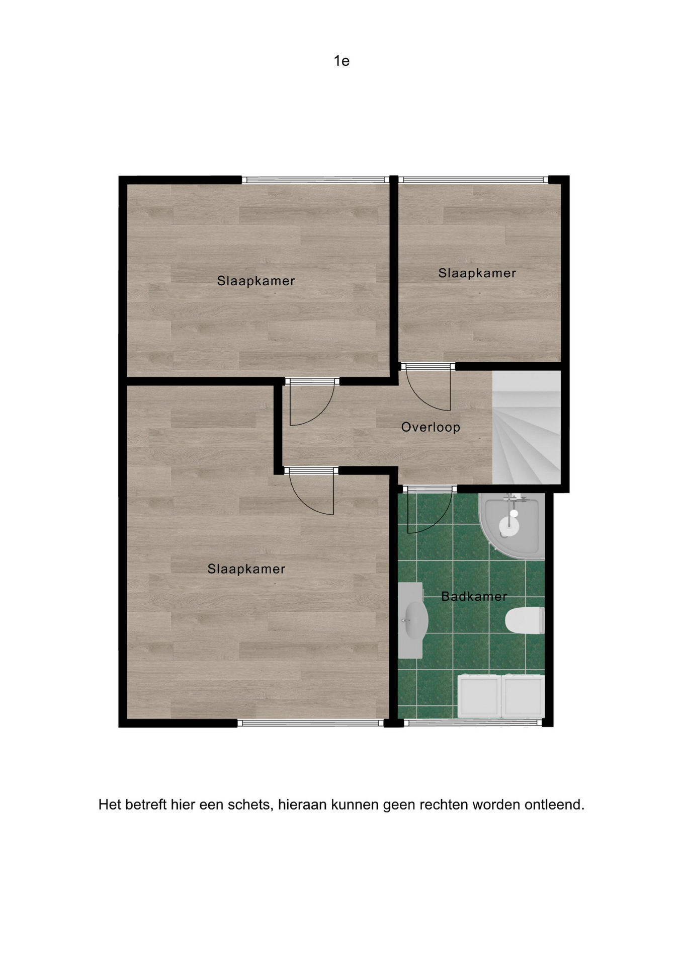 overloop, 3 slaapkamers ca. 450×360, 360×265 en 265×215, badkamer met douchecabine, 2e toilet en wastafelmeubel ca. 325×200. De verdieping is tevens v.v. laminaatvloeren.