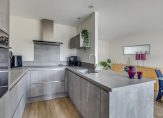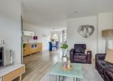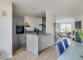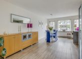 Toegang tot de woonkamer met aan de voorzijde de zitkamer, brede doorloop naar eetkamer en de moderne keuken voorzien van de volgende inbouwappatuur: koel- en vriescombinatie, oven, 2 carrouselkasten, inductiekookplaat, afzuigschouw, Quooker en voldoende opbergruimte.