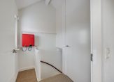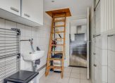 Bijkeuken met opstelplaats voor wasmachine en droger, uitstortgootsteentje en handige bergzolder.