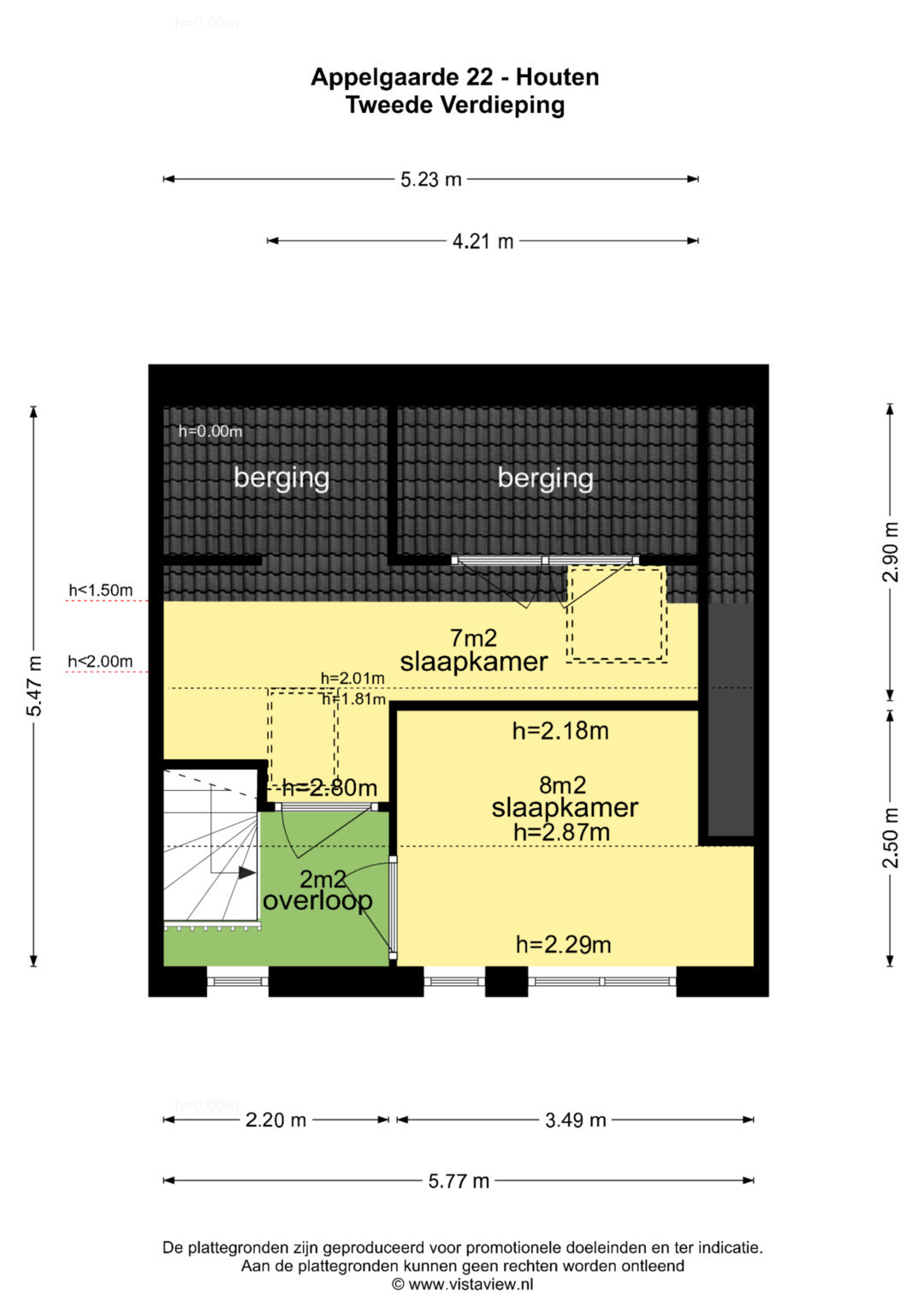De slaapkamers op deze verdieping zijn 7 en 8 m2 groot.