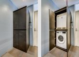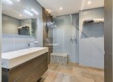 Gang met toegang tot badkamer van 7 m2 met wastafelmeubel met ladeblok en spiegel, inloopdouche met hand-/regendouche voorzien van thermostatische mengkraan, vaste kast voor wasmachine en droger.