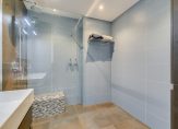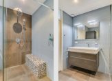 De moderne en luxe uitgevoerde badkamer is volledig betegeld en voorzien van een ruime douchegelegenheid met glazen wand en een regen- en handdouche. Er is vloerverwarming aanwezig en een stijlvol wastafelmeubel met lades en bijbehorende spiegel. De badkamer is afgewerkt met een glad stuc plafond voorzien van inbouwverlichting. Uw wasapparatuur plaatst u in de daarvoor op maat gemaakte kast. Ook de modern betegelde toiletruimte mag er zijn, deze beschikt over een luxe wandcloset en een bijpassend fonteintje.