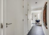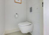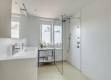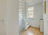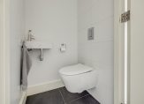 Op de eerste verdieping bereik je via de lichte overloop de separate toiletruimte, de strakke badkamer met ruime inloopdouche, moderne wastafelmeubel en de masterbedroom. Deze masterbedroom heeft toegang tot het riante dakterras van 18 m2, gesitueerd op het Westen, en de via schuifdeuren af te sluiten kastenkamer van 9m2. Wil je van deze kastenkamer weer een slaapkamer maken dan behoort dat uiteraard tot de mogelijkheden.
