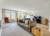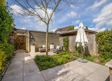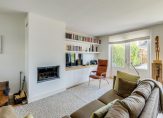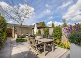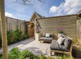 Toegang tot woonkamer van 6.07 breedte met open haard, dubbele tuindeuren, vast raamkozijn en ruime achtertuin die modern is bestraat en de houten berging met het achterom.