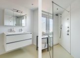 EERSTE VERDIEPING: lichte overloop met toegang tot de separate toiletruimte, luxe badkamer met ruime inloopdouche voorzien van regen- en handdouche, wastafelmeubel met dubbele kranen en laden, raampje met veel lichtinval en vloerverwarming.