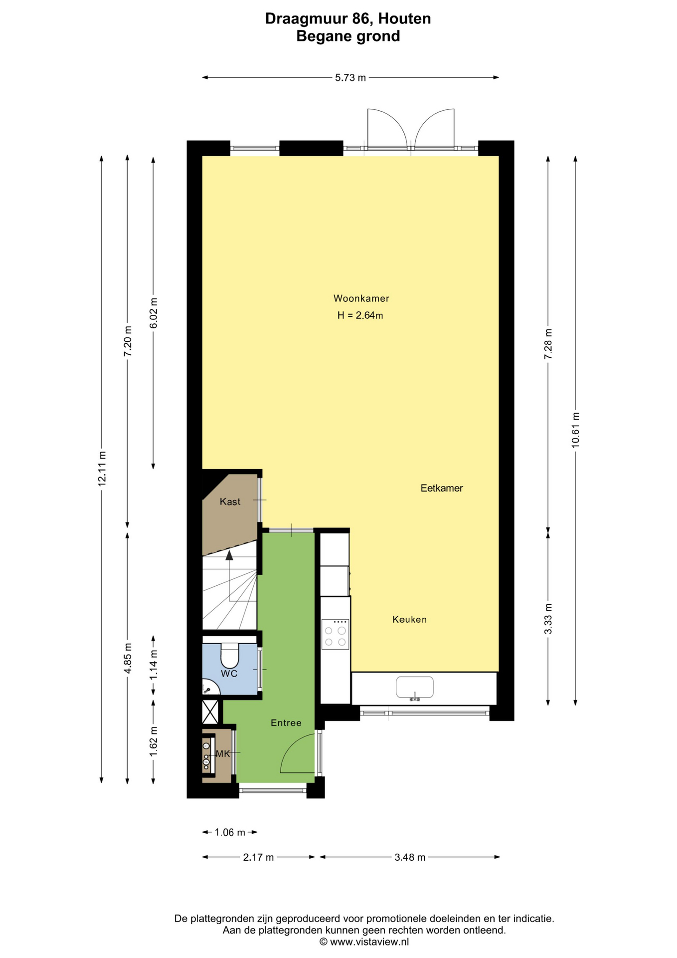 Toegang tot tuingerichte woonkamer van 5.73m breed en 7.28m diep (ca. 41 m2) met trapkast, vast raamkozijn, dubbele tuindeuren, elektrisch zonnescherm en buitenkraan.
