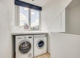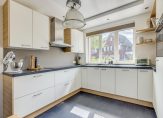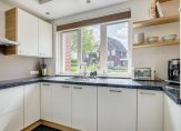 Aan de voorzijde van de woonkamer is de lichte en moderne keuken gesitueerd. Deze fraaie keuken is voorzien van inbouwapparatuur en heeft veel opbergmogelijkheden.