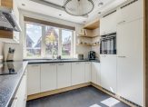 Aan de voorzijde van de woning is de U-vormige keuken gesitueerd die is uitgerust met de volgende inbouwapparatuur: inductiekookplaat met rvs afzuigschouw, vaatwasmachine, spoelbak, combi-oven, vriezer en extra grote koelkast. De keuken heeft veel opbergruimte en is afgewerkt met een fraai aanrechtblad.