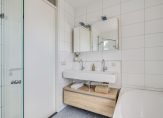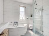 Complete badkamer met licht tegelwerk en groot draai-kiep-raam. Deze badkamer is uitgerust met een wastafelmeubel met dubbele kranen en lades, een ligbad, douche en een wandcloset. De badkamer is vergroot waarbij er een stukje van de slaapkamer ernaast bij de badkamer is betrokken.