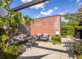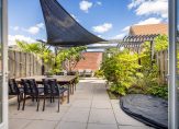 De achtertuin is netjes bestraat en voorzien van een stenen berging en een achterom.