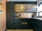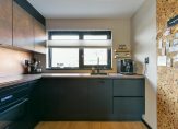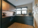 Tussen de woonkamer en de keuken in bevindt zich de trapkast met aansluitend de in hoek opgestelde moderne keuken die is voorzien van de volgende inbouwapparatuur: spoelbak, koel en vriescombinatie, vaatwasmachine, inductiekookplaat, afzuigschouw en combi-oven.
