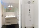 De moderne badkamer is licht betegeld en voorzien van een wastafelmeubel, designradiator, wandcloset en inloopdouche met regendouche.