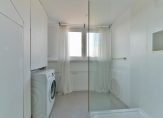 TWEEDE VERDIEPING: overloop, ruime slaapkamer met vaste kastenwand en bergruimte achter knieschotten. Vanaf overloop bereikbare badkamer met wastafelmeubel, opstelplaats wasapparatuur en een douchegelegenheid met regendouche en inbouwverlichting.