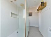 Op de eerste verdieping heeft deze woning drie slaapkamers en de badkamer. Deze badkamer beschikt over een wastafelmeubel met dubbele kranen, een inloopdouche met hand- en regendouche, wandcloset, designradiator en licht tegelwerk.