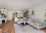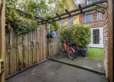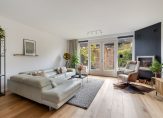 Toegang tot de lichte woonkamer met trapkast, dubbele tuindeuren, zonnige tuin, houten berging, overkapping en een achterom. De woonkamer is ruim 38 m2 groot en afgewerkt met fraaie houten vloerdelen.