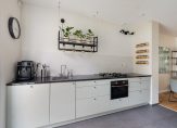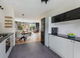 De keuken is aan de voorzijde van de woning geplaatst en is voorzien van diverse inbouwapparatuur. Ook hier zorgt de grote raampartij weer voor en mooie lichtinval en heb je direct zicht op de groenzone voor de woning.