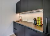 Toegang tot de bijna 5 meter brede woonkamer met moderne en luxe keuken die is uitgevoerd in een eigentijdse kleurstelling, voorzien van de volgende inbouwapparatuur: keukenblok met aanrechtblad en spoelbak, vaatwasmachine, koel- en vriescombinatie en mooie opbergruimte in bovenkasten. Kookeiland met inductiekookplaat, combi-oven, afzuigschouw, kastruimte en ruimte om eventueel barkrukken te plaatsen.