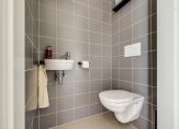 APPARTEMENT TWEEDE VERDIEPING: Hal met meterkast voorzien van glasvezel aansluiting, modern betegeld en separaat toilet met wandcloset en fonteintje.