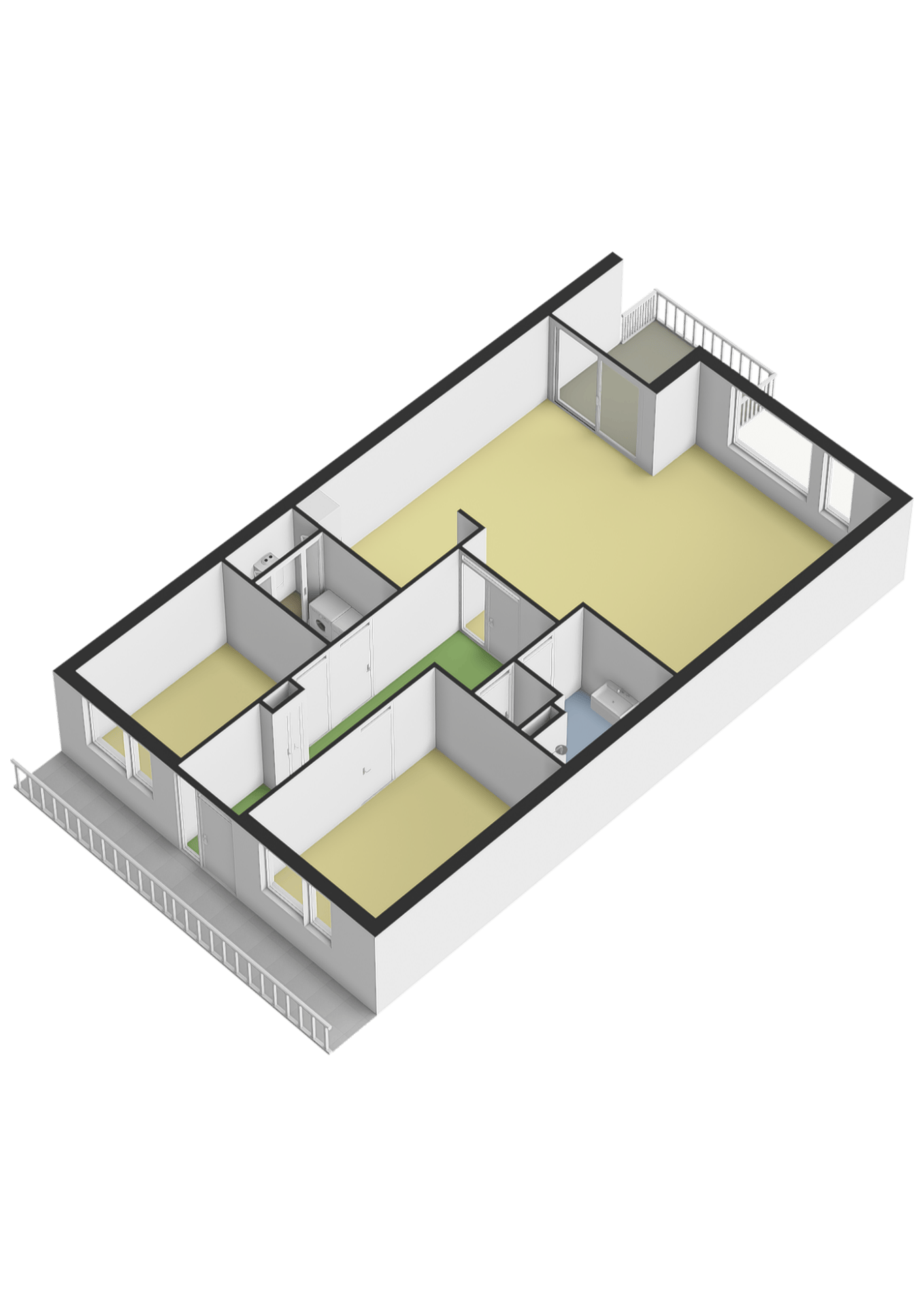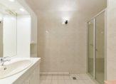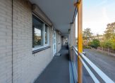 Galerij met entree van het appartement in een ruime hal met meterkast, twee slaapkamers van 10 en 15 m2, praktische bergruimte met c.v.-installatie en opstelplaats wasapparatuur, een separaat toilet met fonteintje en een keurig betegelde badkamer voorzien van inloopdouche met drain, wastafelmeubel voorzien van wastafel en kastruimte.