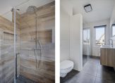 1e verdieping: Overloop met vaste trap naar 2e verdieping / royale ouderslaapkamer (voormalig 2 slaapkamers) / badkamer met dubbel wastafelmeubel, 2e toilet met inbouwreservoir en ruime inloopdouche met rainshower / ruime slaapkamer.