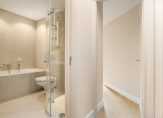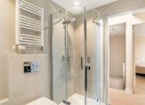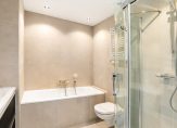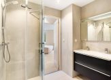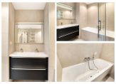 De moderne en luxe badkamer op de 1e verdieping is uitgerust met een douche, ligbad, dubbele wastafel, spiegel en een toilet.