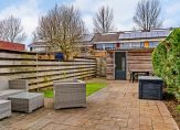 De zonnige achtertuin is ca. 15 meter diep, geheel voorzien van bestrating en heeft een houten berging met achterom. Gezien de diepe van de achtertuin kunt u de hele dag genieten van de zon.