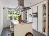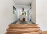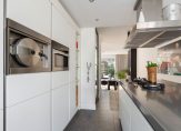 Bij aankomst valt direct de eigen oprit en berging– ideaal voor het opbergen van fietsen, gereedschap of andere spullen. Via de verzorgde voortuin betreed je de woning en kom je in de ruime hal met garderoberuimte, een trapopgang naar de eerste verdieping en een modern separaat toilet. Vanuit de hal heb je binnendoor toegang tot de ruime berging: praktisch en comfortabel. Aan de rechterzijde van de hal betreed je de luxe open keuken, compleet uitgerust met hoogwaardige inbouwapparatuur. Het royale kookeiland biedt volop werk- en zitruimte, perfect voor gezellige kookmomenten. Een slimme toevoeging is de stoomoven, waarmee je gezond en snel heerlijke maaltijden bereidt. Aansluitend kom je in het royale eetgedeelte, een echte eyecatcher dankzij de indrukwekkende hoge ramen die zorgen voor een overvloed aan natuurlijk licht. De split-level indeling geeft het geheel een speels en ruimtelijk karakter. Een paar treden lager ligt de sfeervolle woonkamer (45 m2) aan de achterzijde van de woning. Vanuit hier heb je prachtig zicht op de tuin én het water. Dankzij de grote schuifpui verbind je binnen moeiteloos met buiten.