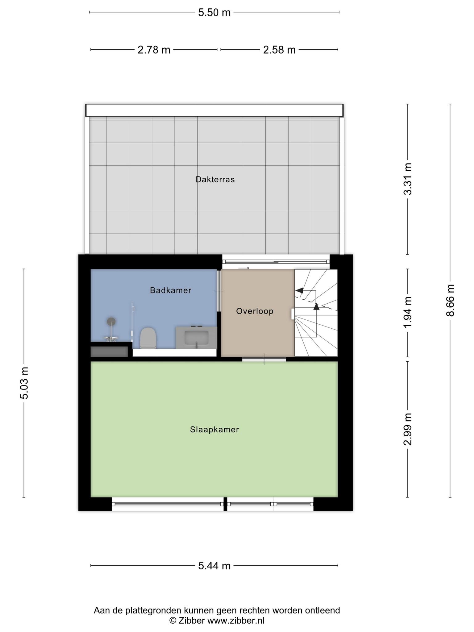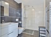 Op de eerste verdieping bevinden zich een ruime slaapkamer en een comfortabele badkamer. De badkamer is 5 m² groot en voorzien van een toilet, wastafel en inloopdouche.