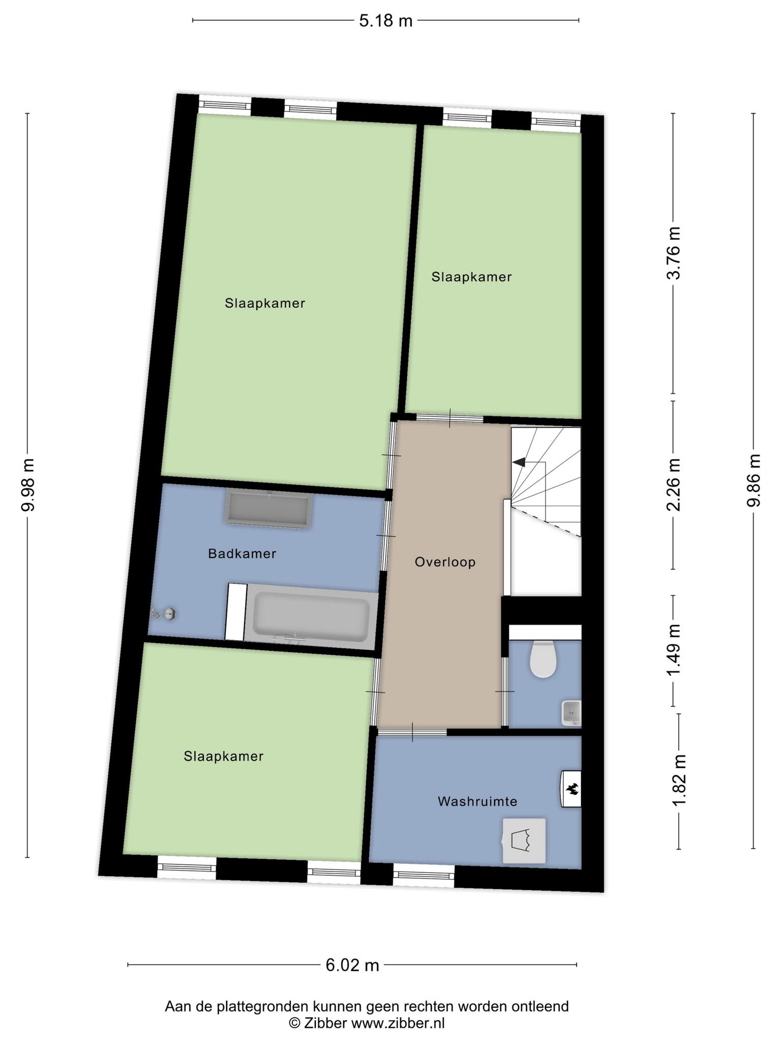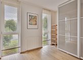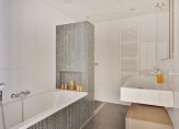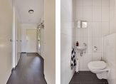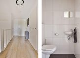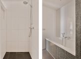 Door naar de derde etage. Via de overloop is er toegang tot het separaat tweede toilet, drie goede slaapkamers, de badkamer en een separate ruimte welke is voorzien van de wasmachine aansluiting en de cv-installatie, tevens is hier voldoende bergruimte aanwezig. De badkamer is voorzien van een ligbad, een ruime inloopdouche, wastafel, vloerverwarming en een radiator. De badkamer is ten opzichte van de andere woningen in het blok 20 cm breder.