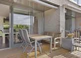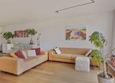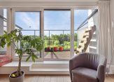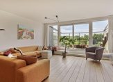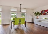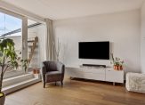 We nemen de trap naar de eerste verdieping. Zeer lichte en ruime woonkamer, door de raampartijen aan weerszijden en de fantastische zon ligging op het zuiden, is daglicht in de woonkamer dus gewaarborgd. De woonkamer is evenals de rest van de woning netjes afgewerkt en heeft een houten vloer. Vanuit de woonkamer heb je door middel van de schuifpui toegang tot het tweede terras, welke even als het terras beneden gesitueerd is op het zuiden.