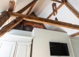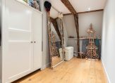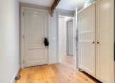 De royale woonkamer en eetkamer zijn voorzien van een fraaie houten vloer en worden gescheiden door karakteristieke houten deuren. De balkenplafonds geven de ruimte een warme, historische uitstraling.