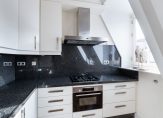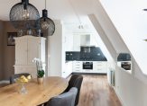 ^ Moderne keuken in lichte kleuropstelling met inbouwapparatuur