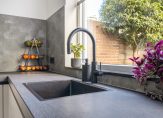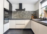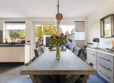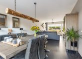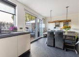 De begane grond is een plek van comfort, met zijn royale zitgedeelte van 32 m². De woonkamer heeft veel lichtinval dankzij de brede schuifpui naar de tuin. De donkere plavuizen vloer met vloerverwarming zorgt voor comfort én een strakke uitstraling. De open keuken is geplaatst in 2024 en heeft alles wat je hartje begeert qua apparatuur en afwerking. De keuken is volledig voorzien van Miele inbouwapparatuur; inductiekookplaat, extra grote koelkast, vaatwasser, afzuigkap, combi/oven combinatie en een stoomoven. Ook bevat de keuken een Quooker,