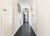 Bij binnenkomst ervaar je direct de moderne uitstraling van de woning. De ruime hal is voorzien van een strakke tegelvloer, meterkast en biedt toegang tot de inpandige garage en via de deur naar de gang bevindt zich rechts de separate wasruimte. Via een paar treden bereik je de gang, waar zich aan de linkerzijde twee slaapkamers bevinden die ook uitstekend geschikt zijn als praktijk- of werkkamer. Aan de rechterzijde kom je eerst binnen in de badkamer: een frisse en verzorgde ruimte met douche, wastafelmeubel en designradiator. Direct ernaast ligt het toilet, voorzien van fontein. Daarnaast bevindt zich de technische ruimte, waar de cv-installatie netjes is ondergebracht.