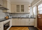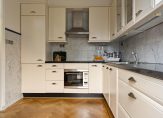 Bij het eetgedeelte is een deur naar de dichte keuken, waar een mooie hoekopstelling staat. Het aanrechtblad is van natuursteen en op de achterwand zie je fraai marmer tegelwerk. Alle benodigde apparatuur is ingebouwd: een inductie kookplaat, afzuigkap, combimagnetron, koelkast (2022) en een vriezer.