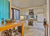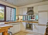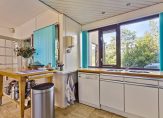 In de keuken staat een hoekopstelling met een houten blad, dubbele spoelbak en een spiegelwand. De gaskookplaat, afzuigkap, oven en koelkast zijn ingebouwd. Door het grote raam kijk je naar het autovrije pad en het vele groen. Vanuit de woonkamer is een portaal te bereiken, met de trapopgang en toiletruimte met fonteintje.