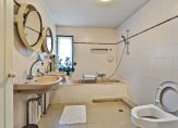 Niet alleen de slaapkamers, maar ook de badkamer is heel ruim. Aan de kant van het raam staat het ligbad en verder is deze badkamer ingedeeld met een douche, tweede toilet en twee wastafels.